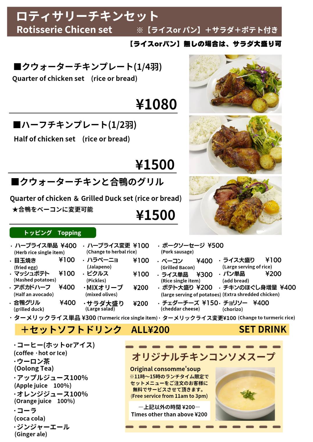 EAT IN MENU イートインメニュー(税込) 店内では焼きたてのロティサリーチキンをお召し上がりいただけます。プレートメニューを中心にボリューム満点のメニューをお楽しみください。 更新日 2025年05月28日